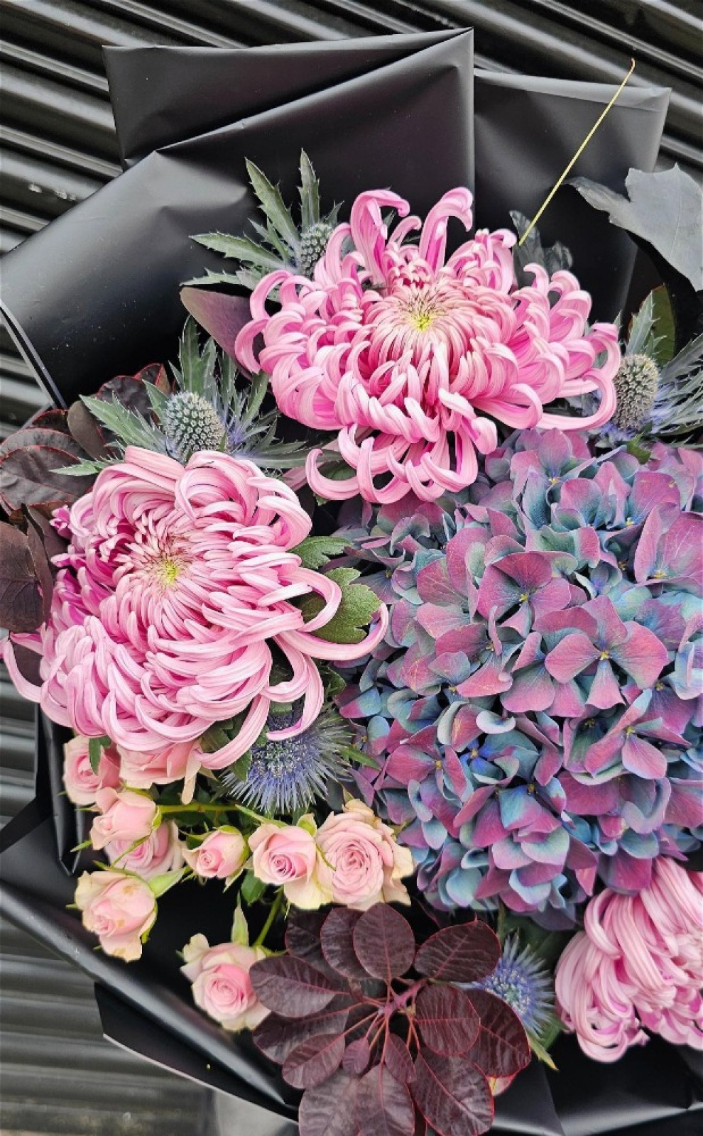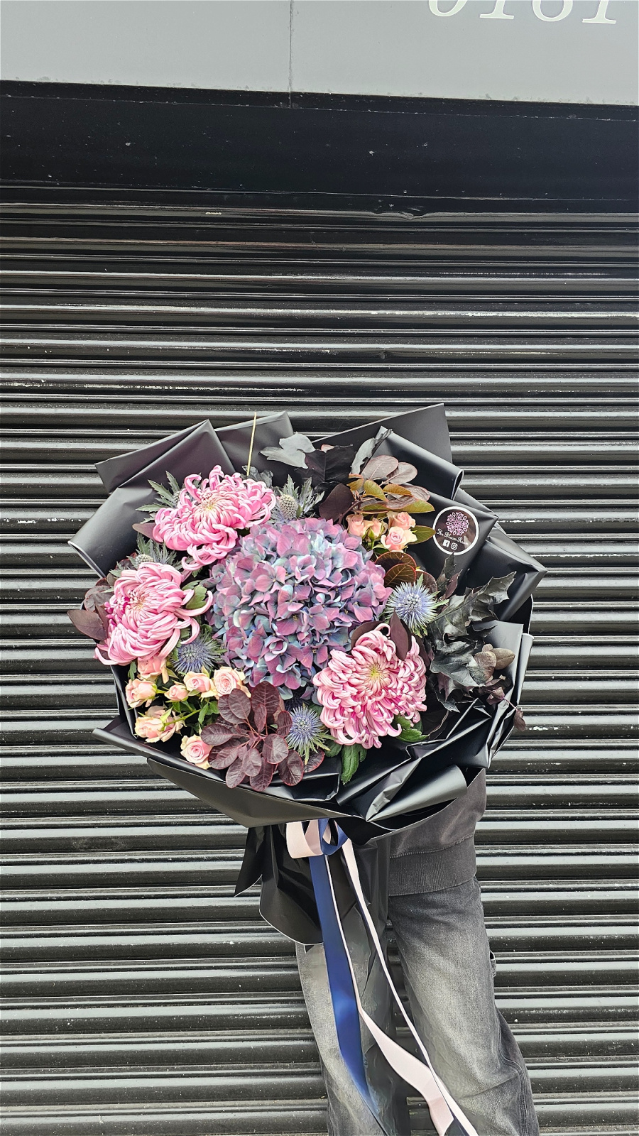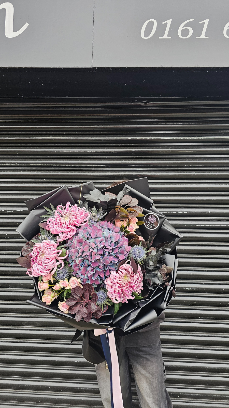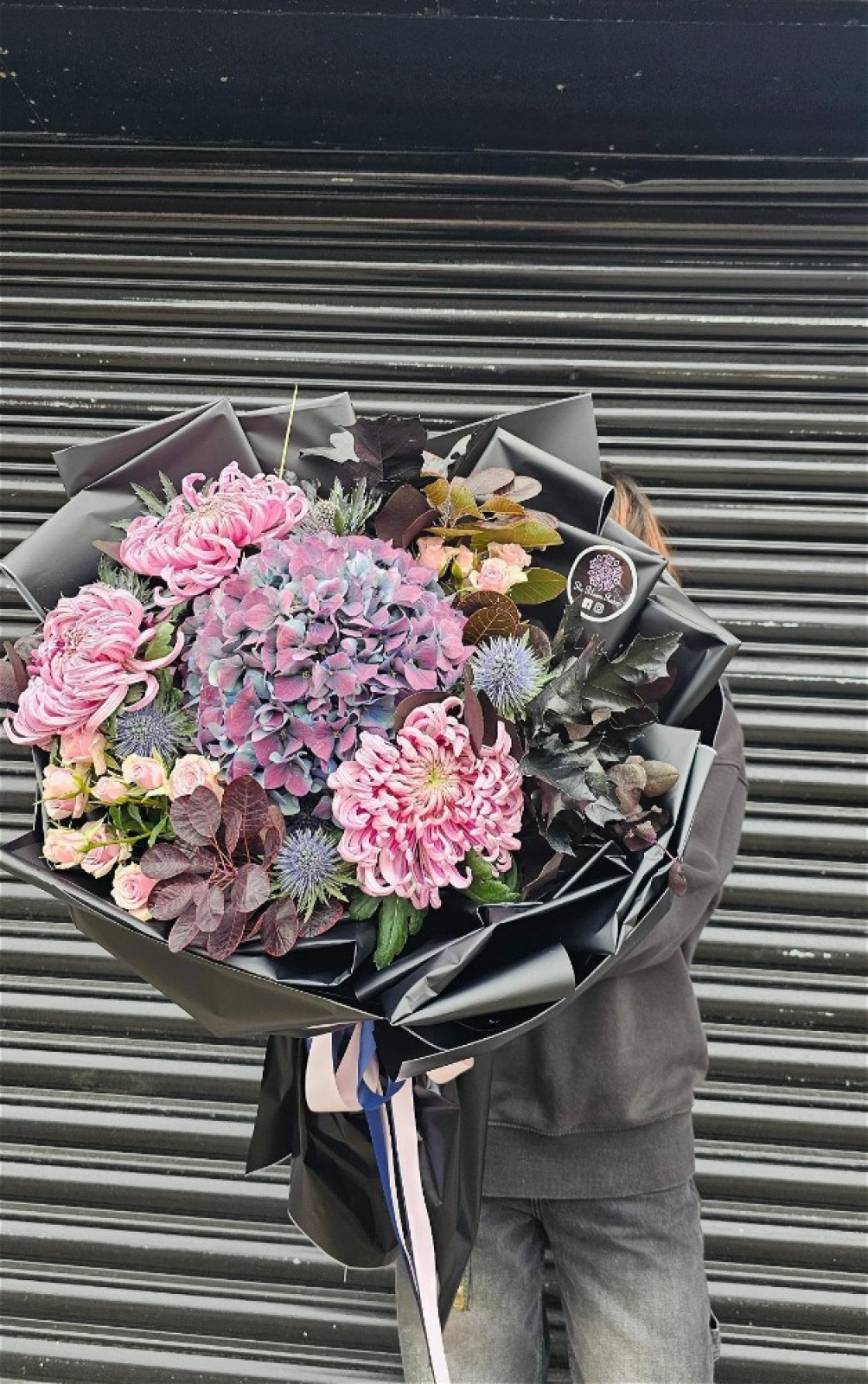 Stunning Vienna is composed with vintage looking hydrangeas seasonal pink blooms , autumnal foliage blue thystle and spray lilac rose